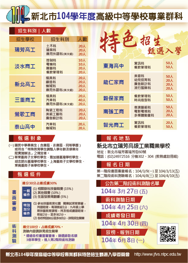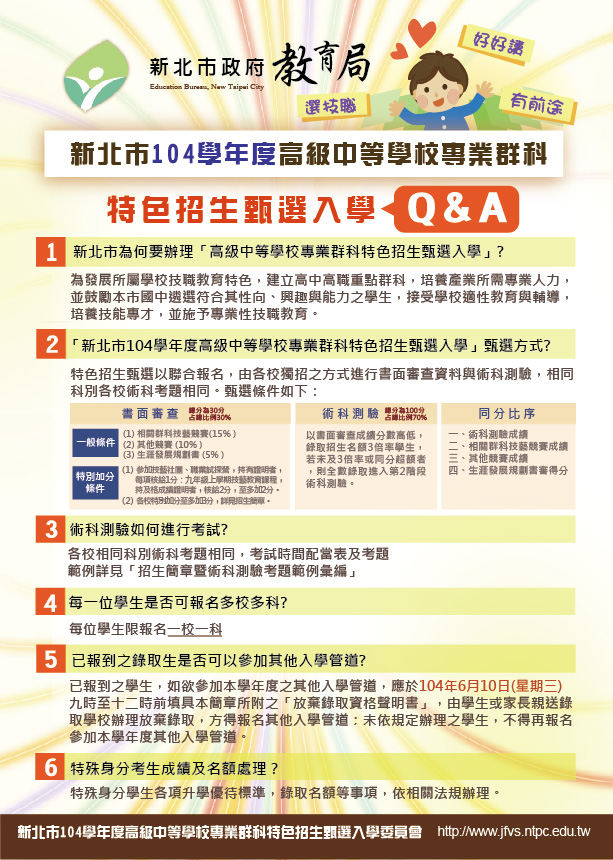 [公告] 有關新北市辦理「新北市104學年度高級中等學校專業群科特色招生甄選入學」宣導事宜